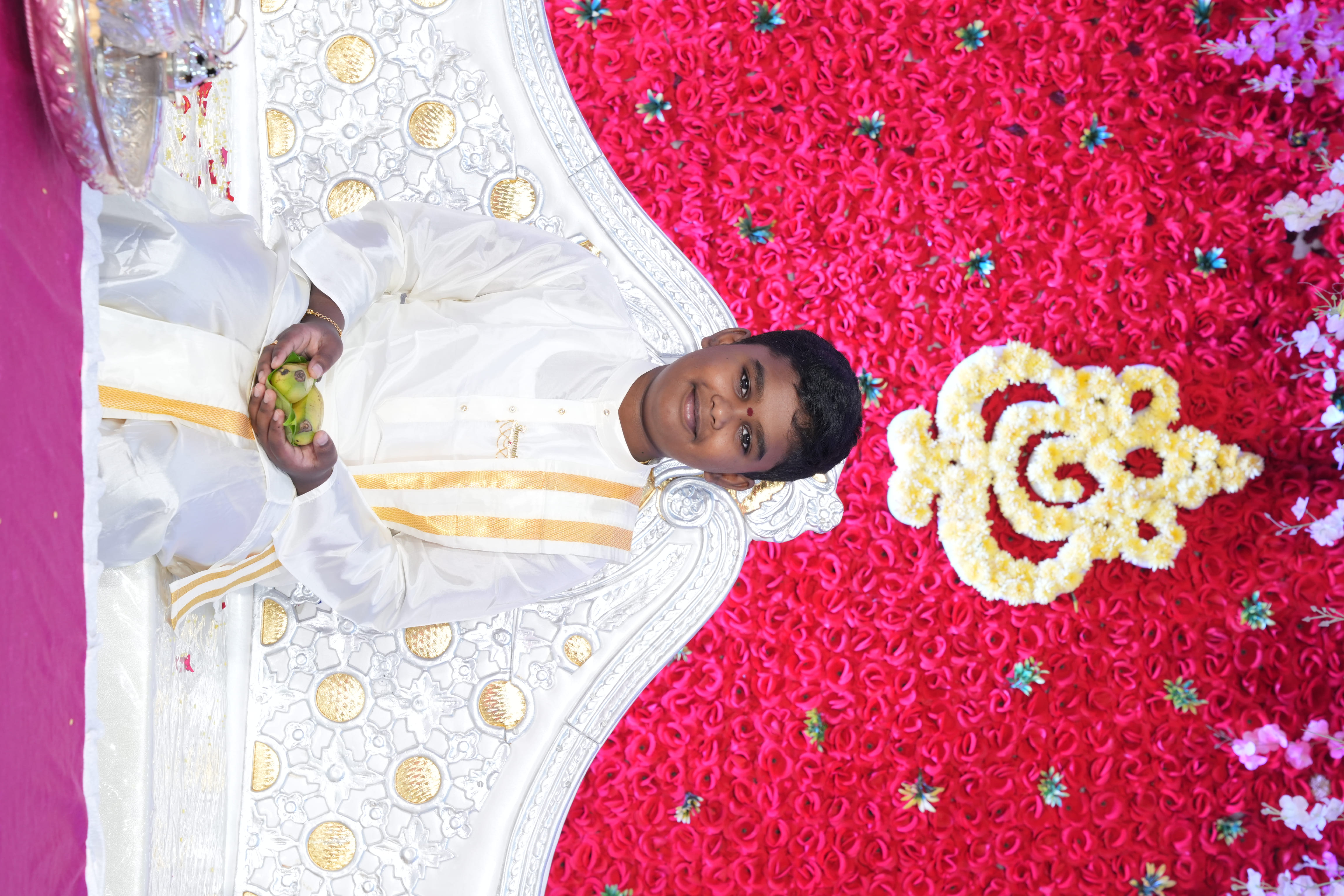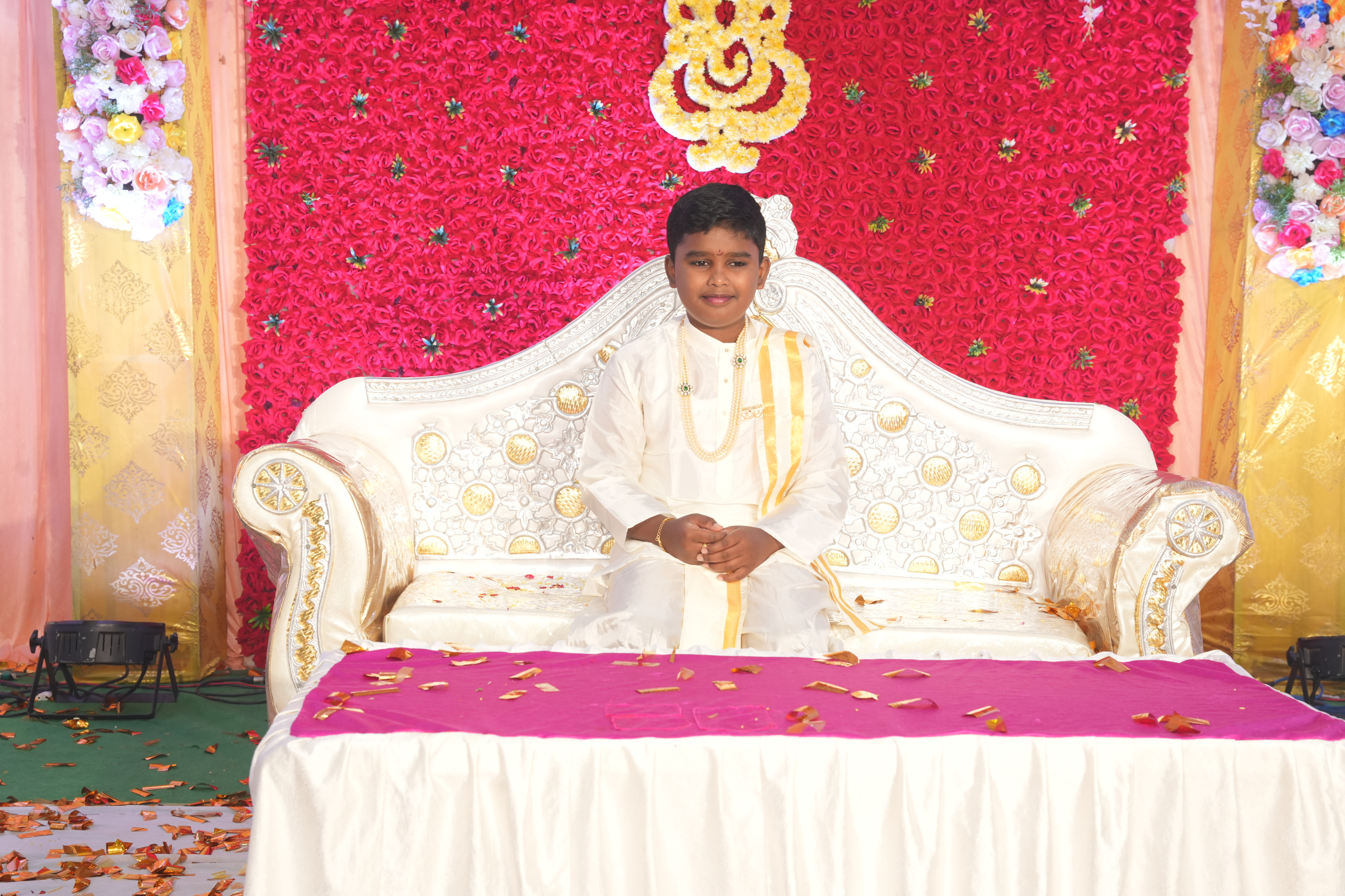 Attire: The boy is dressed in a dhoti (veshti) for the first time.